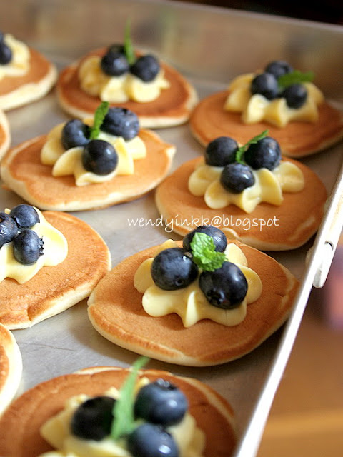 A delicious pancake served with delicious pastry cream. Made mini so that one can pop one pancake into one’s oral cavity at one go. Or you can just use fork and knife and slowly savour it. Whichever way, it is still delicious. My MIL said, this converted her to love pancakes as she always find pancakes to be floury and yucky. Well, she's been eating those from mixes in the US. So, can't blame her for hating pancakes. Now she loves them, but made this way.